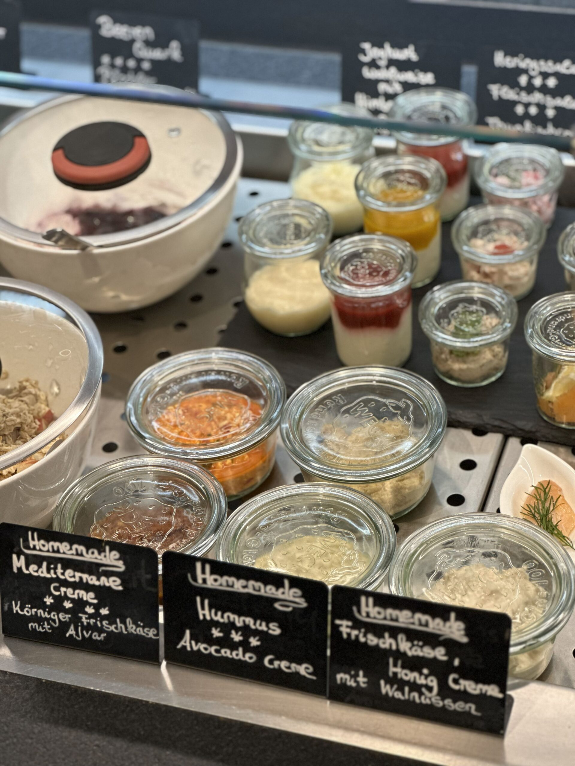 Mediterrane Creme | cremiger Hummus | Avocadocreme | griechischer Joghurt mit Honig & Walnüssen | Birchermüsli | Rote Grütze mit Quark | frische Pancakes mit Blaubeeren