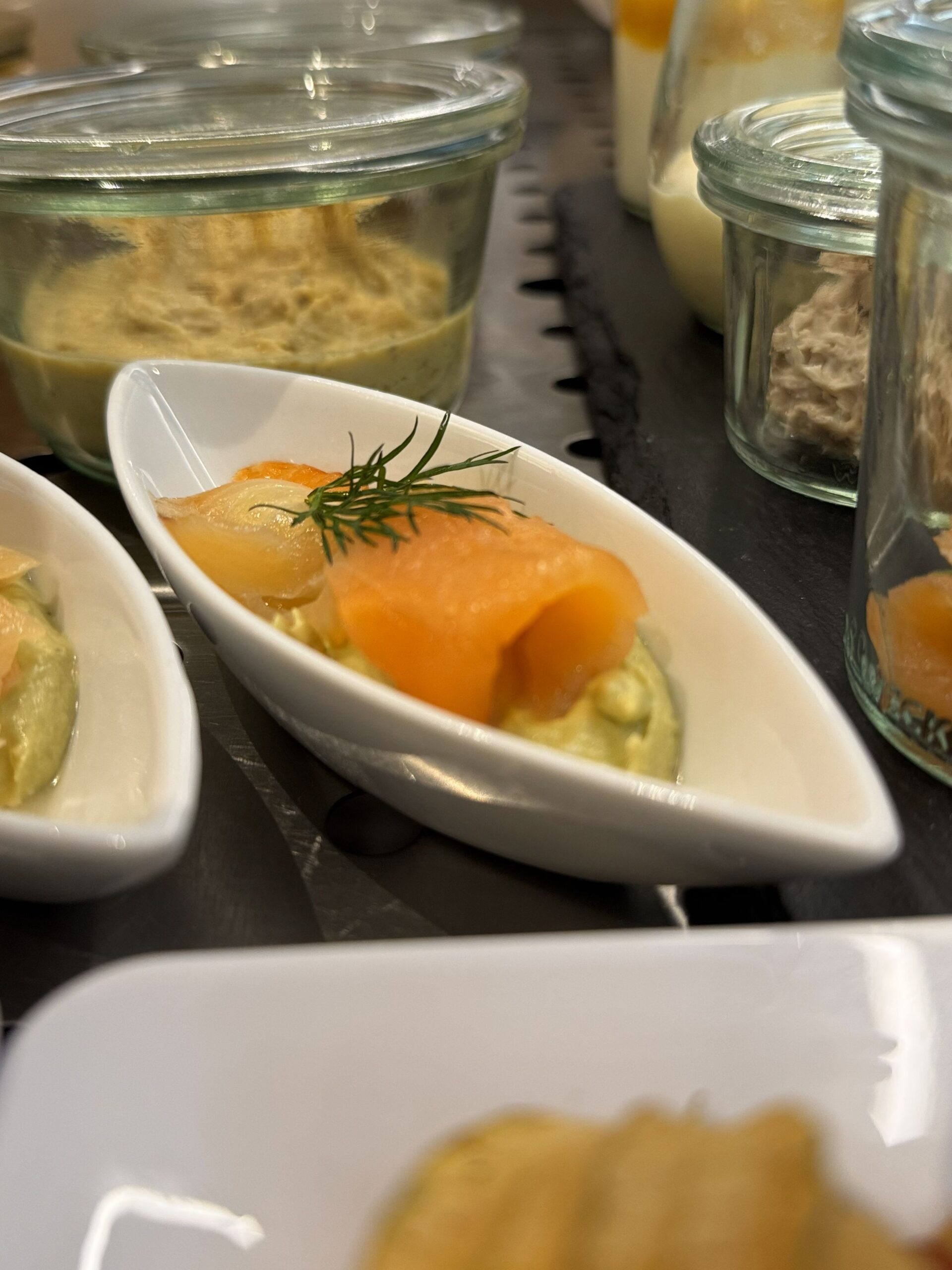 Lachs, Heringssalat, Fleischsalat, hausgemachte Thunfischcreme, Milchreis sowie Joghurt mit Himbeer- oder Mangopüree.
