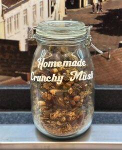 Besonders beliebt ist unser hausgemachtes Crunchy-Müsli aus Haferflocken, Nüssen, Cranberries, Zimt und Honig – ein knuspriger Favorit, der zu Joghurts und Früchten hervorragend passt.